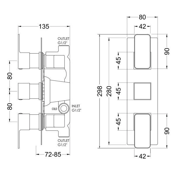 This Windon square concealed shower valve from Nuie features 3 controls for adjusting temperature, flow diverter and flow rate. A fully reversable cartridge means that if you install pipes the wrong way round it can be adjusted without re plumbing the valve, it also features full thermal protection to prevent scalding in the event of cold water shut off.